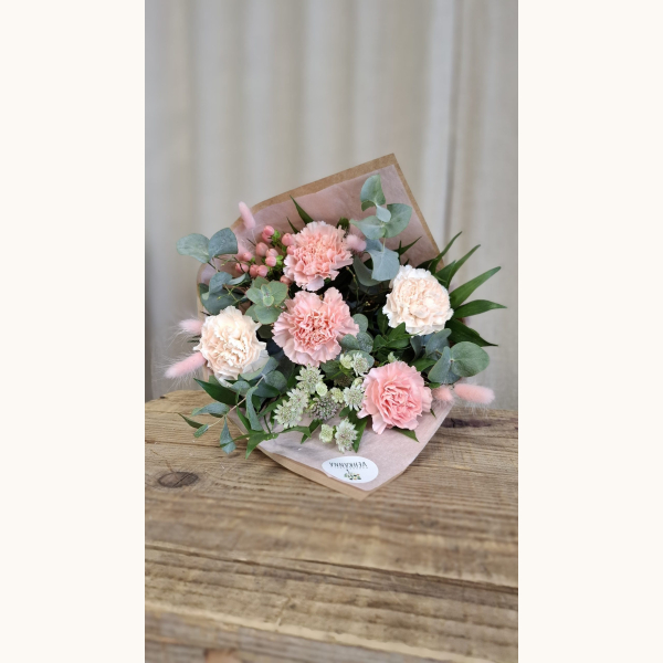 Ilmava, rennosti sidottu kimppu neilikoista, hempeissä eri sävyissä. Floristi valitsee yhteensopivat sävyt ja lisäkukkamateriaalit kaupan valikoimasta. Kuvan kimppu herkkä.