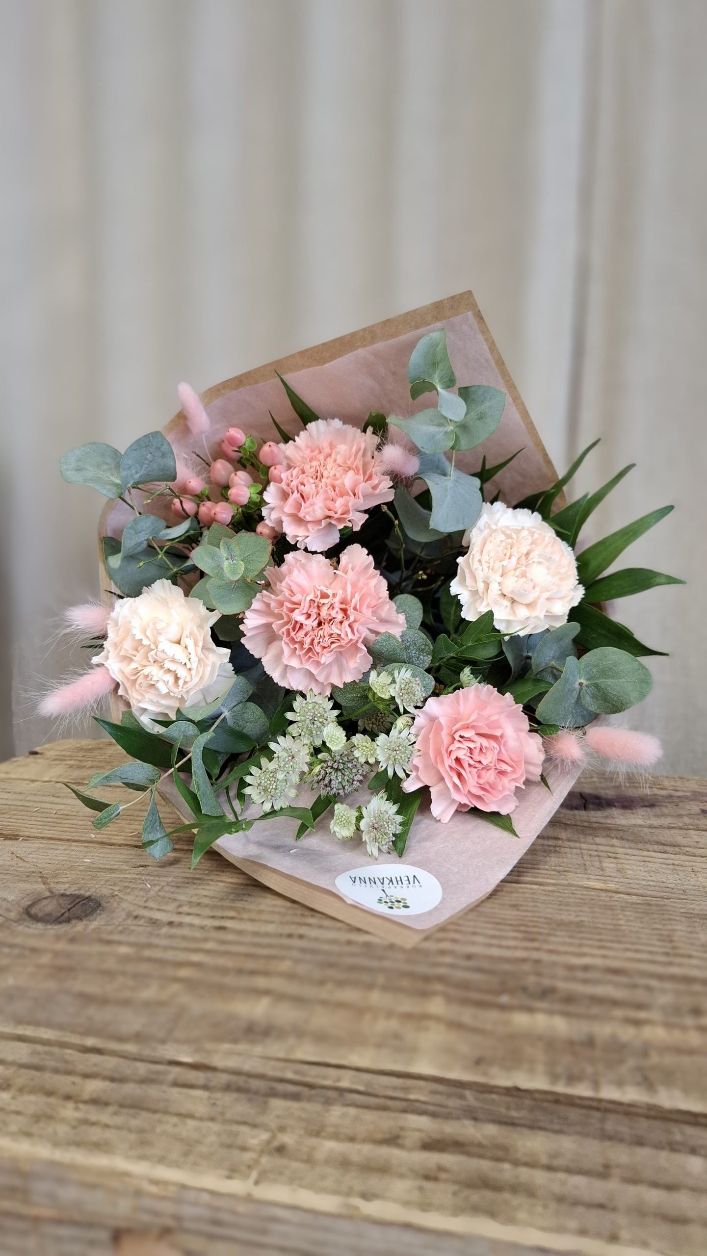 Ilmava, rennosti sidottu kimppu neilikoista, hempeissä eri sävyissä. Floristi valitsee yhteensopivat sävyt ja lisäkukkamateriaalit kaupan valikoimasta. Kuvan kimppu herkkä.