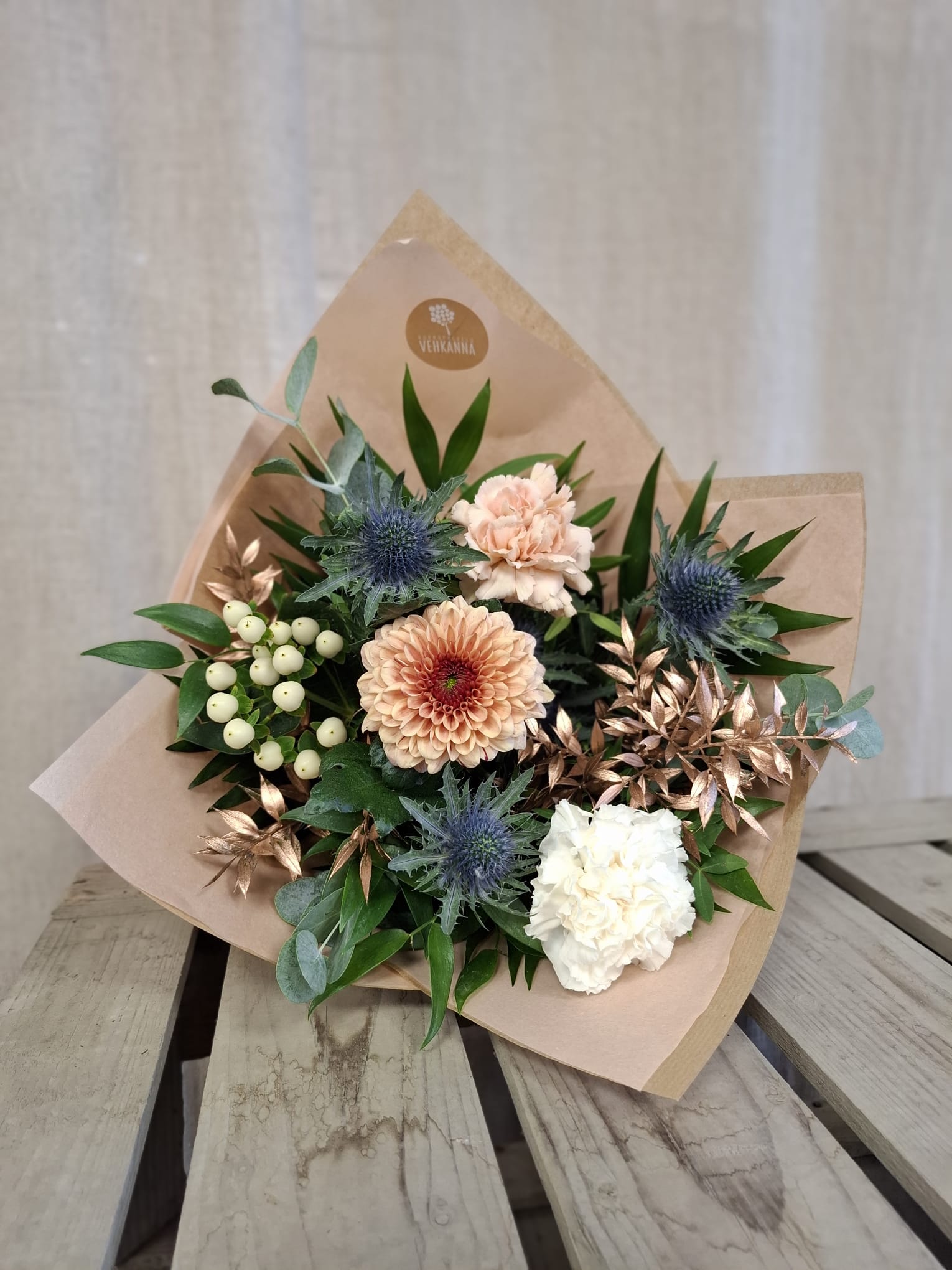 Luonnonsävyinen ilmavasti sidottu kimppu kauden kukista. Kukkamateriaalit voivat vaihdella saatavuuden mukaan. Kuvan kimppu herkkä.