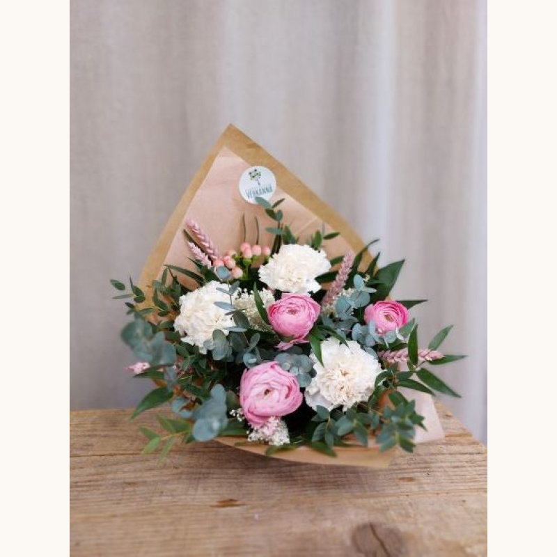 Ilmava, rennosti sidottu kimppu leinikkien ympärille. Kukkien värit vaihtelevat saatavuuden mukaan vaalean ja pinkin sävyissä. Kuvan kimppu herkkä.