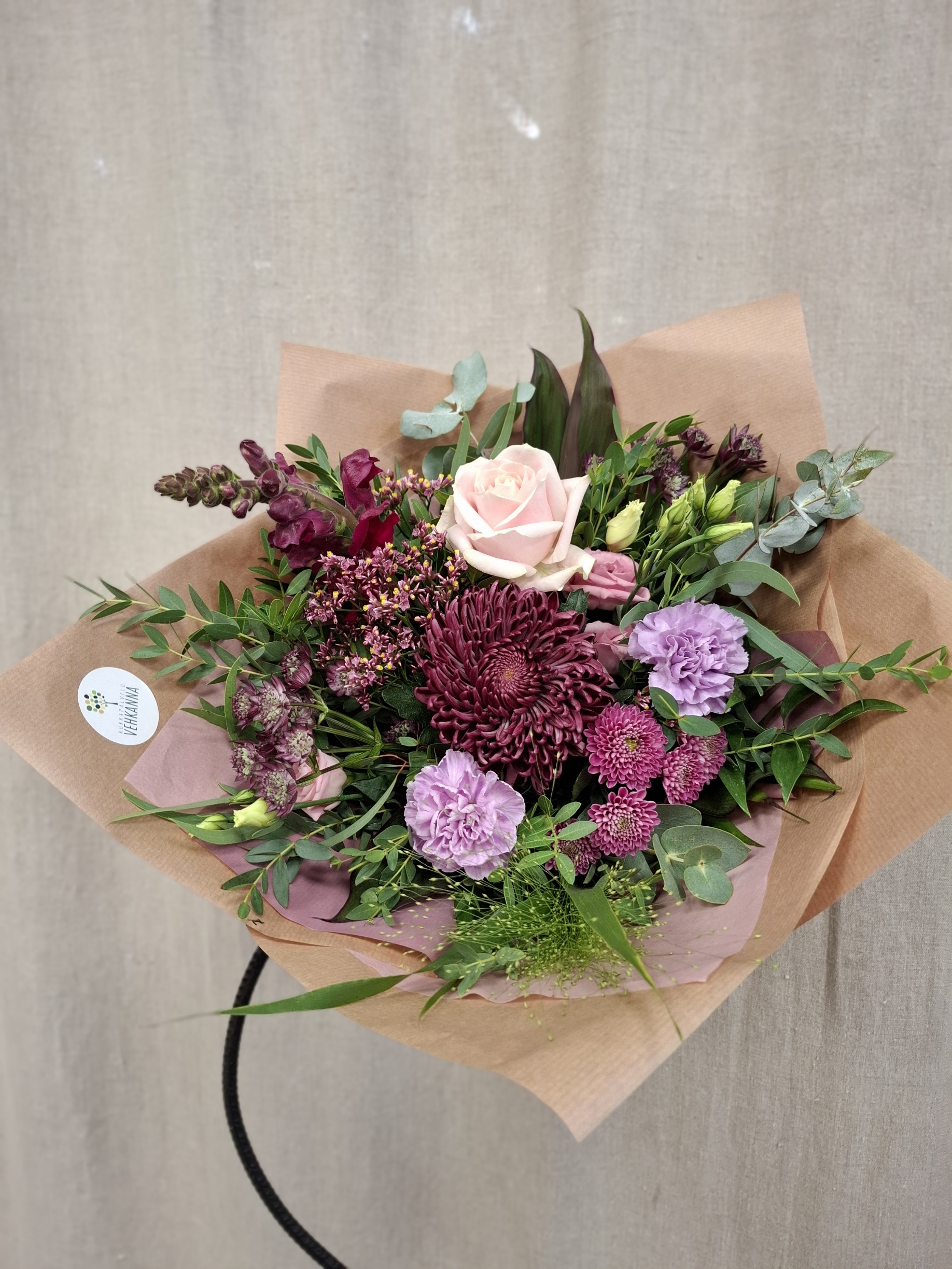 Ilmava, rennosti sidottu kimppu lilan eri sävyissä. Floristi valitsee yhteensopivat kukat kaupan valikoiman ja saatavuuden mukaan. Kuvan kimppu hieno.