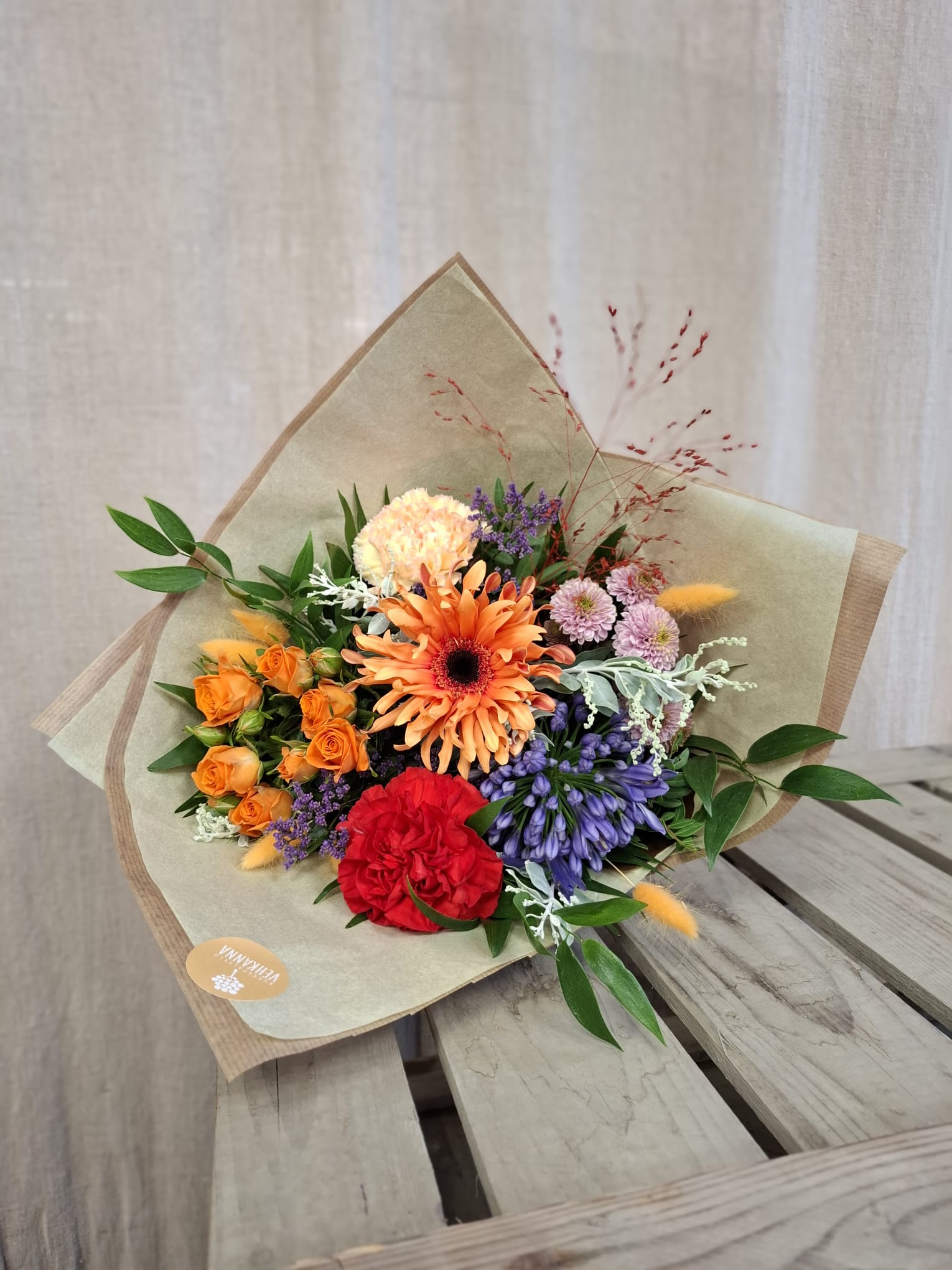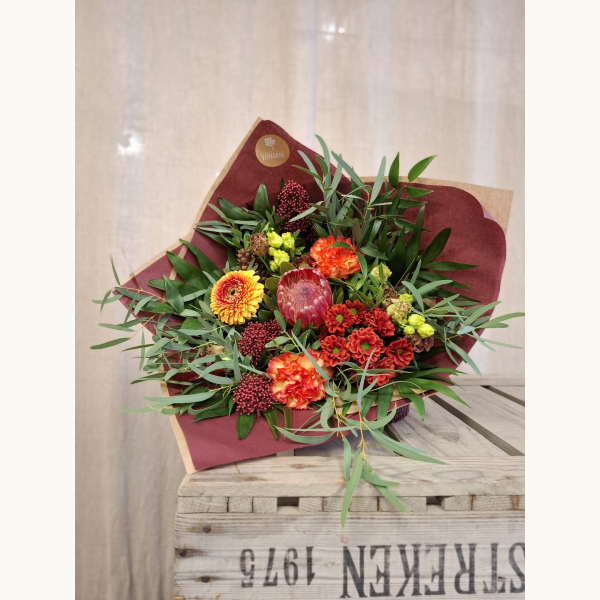 Värikäs ilmavasti sidottu kimppu kauden kukista. Floristi valitsee yhteensopivat kukat ja kukkamateriaalit vaihtelevat saatavuuden mukaan. Kuvan kimppu herkkä.