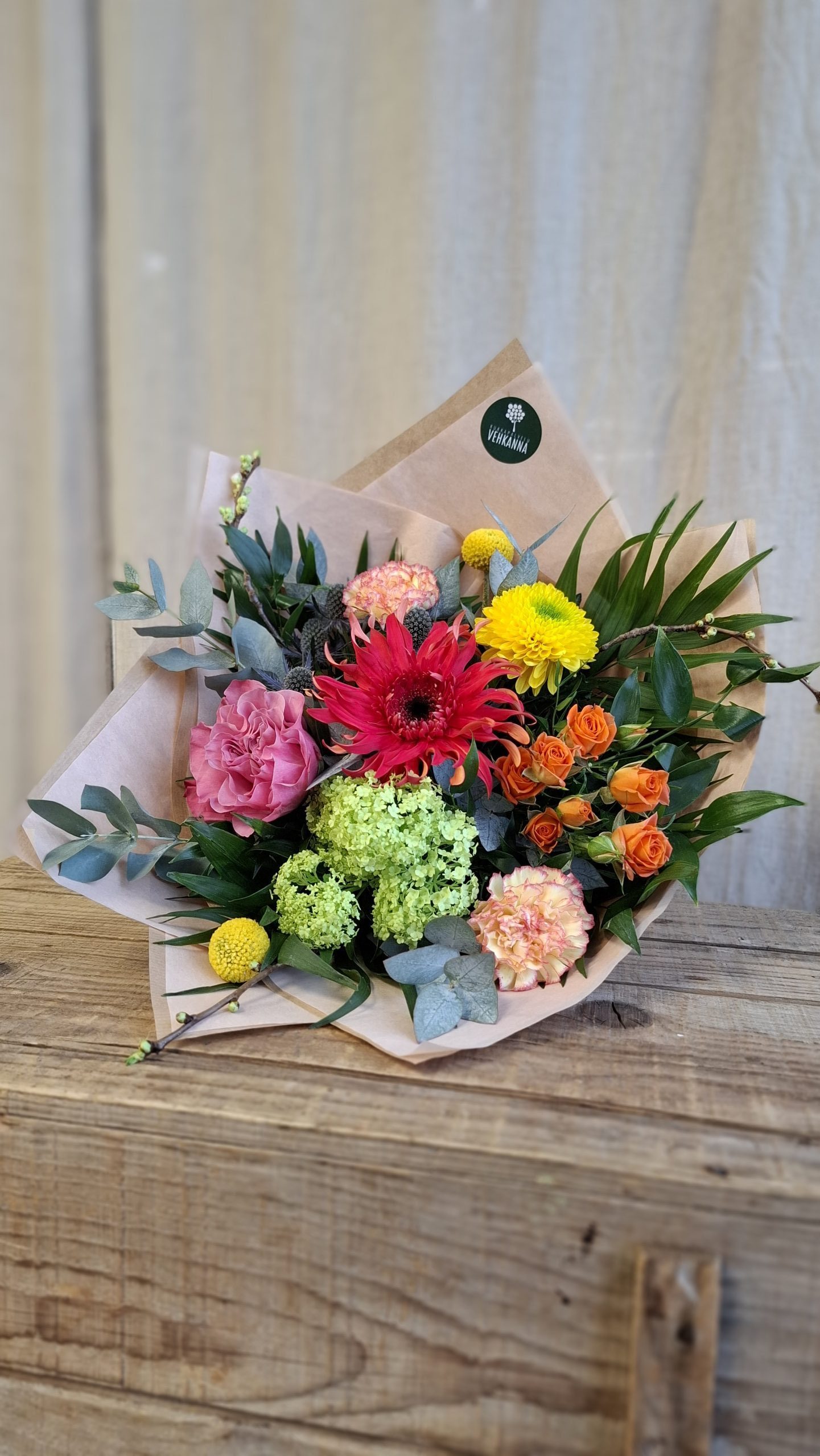 Ilmava, rennosti sidottu kimppu hempeissä eri sävyissä. Floristi valitsee yhteensopivat kukat kaupan valikoiman ja saatavuuden mukaan. Kuvan kimppu herkkä.
