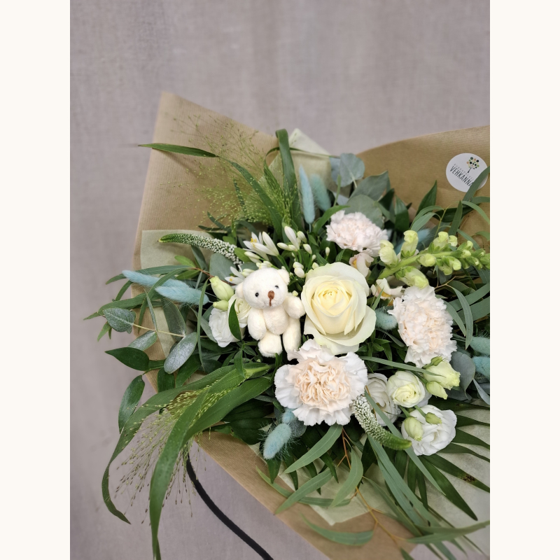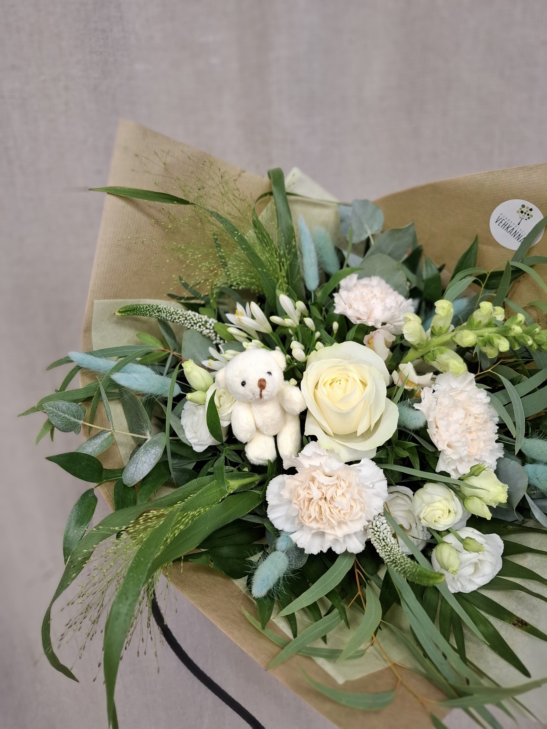 Vaaleasävyinen kimppu kauden kukista. Floristi valitsee yhteensopivat kukat kaupan valikoimasta. Kimpussa lisänä söpö nalle. Halutessasi voit toivoa kimpun värimaailmaa myös lisätietoja kohdassa.