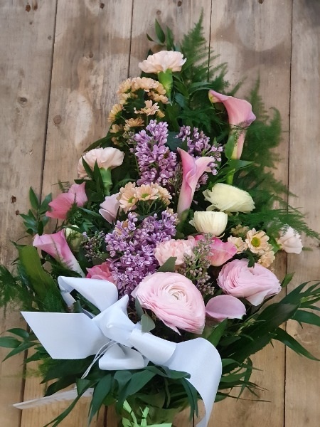 Herkkäsävyinen muistotilaisuudessa laskettava surulaite valkoisista ja vaaleanpunaisista kukista. Floristi valitsee kauden kauneimmat kukat kaupan valikoimasta.